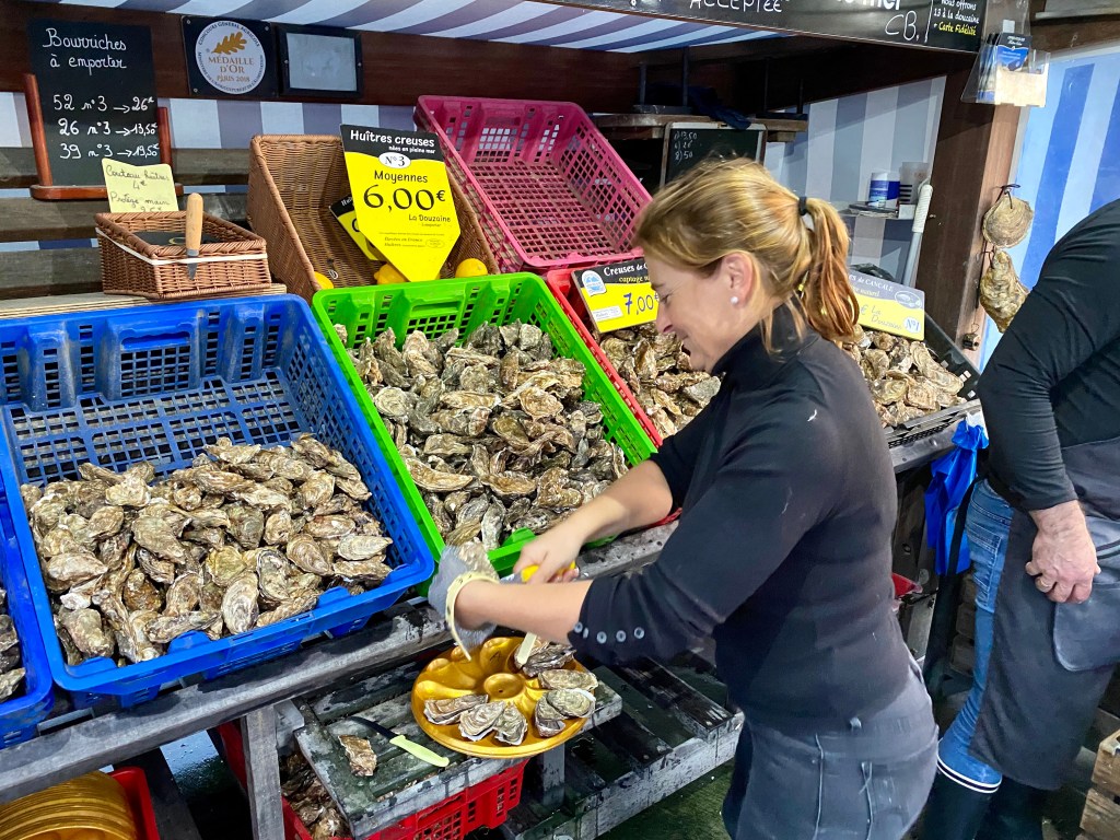 Cheerful vendor shucks and serves Cancale oysters